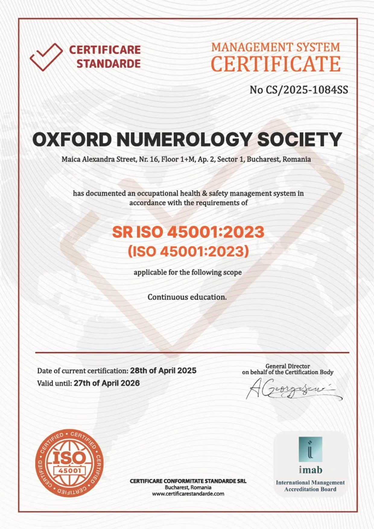 Through the ISO 45001 certification, Oxford Numerology Society upholds its institutional responsibility