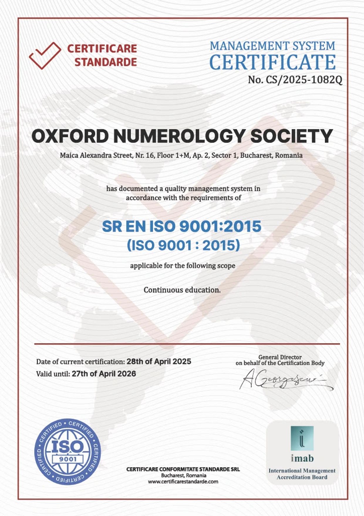 The ISO 9001 certification reflects Oxford Numerology Society’s dedication to excellence, consistency,