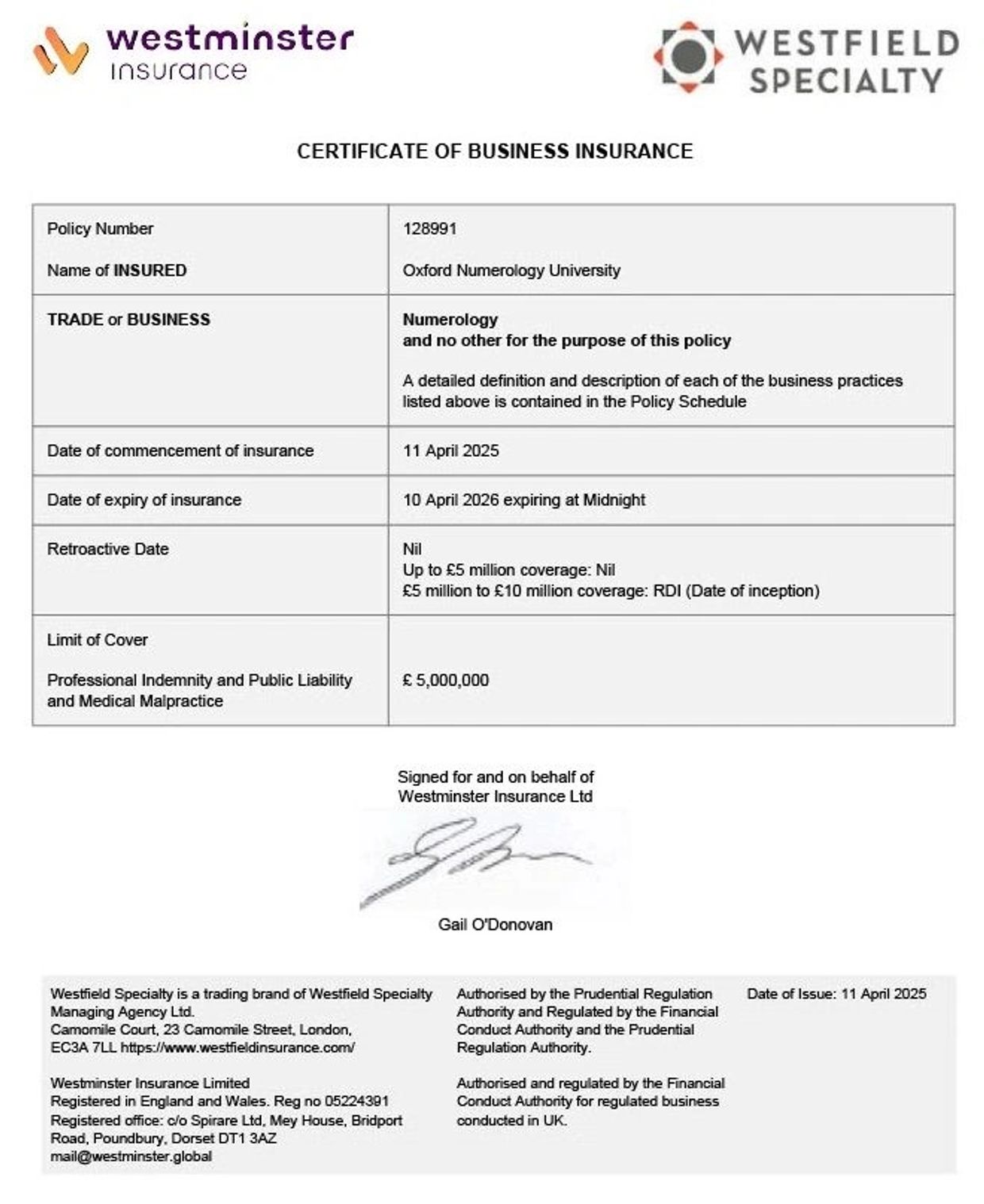 All students, graduates, and faculty members of Oxford Numerology University® are covered by a comprehensive professional liability insurance policy with a coverage limit of £5,000,000 (GBP). This policy ensures full protection during all training, consultancy, and evaluation activities carried out under the academic and professional authority of the Oxford Numerology University®. We believe that credibility and responsibility are essential in the practice of numerology. Our commitment to international safety standards, ethics, and transparency is reflected in this institutional insurance protection, valid across all accredited countries and territories.